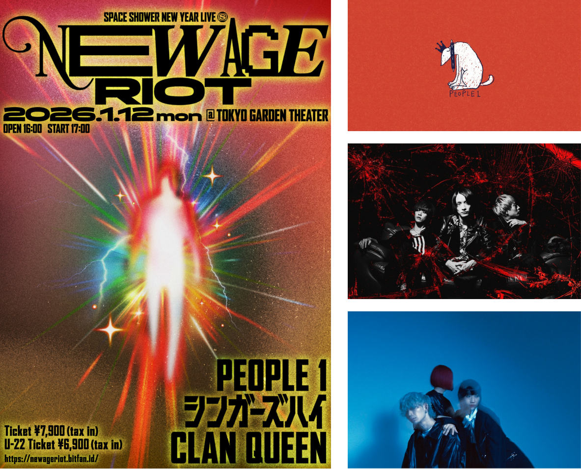 スペースシャワーが新成人世代にお届けするライブ企画 「SPACE SHOWER NEW YEAR LIVE NEW AGE RIOT」開催決定! PEOPLE 1、シンガーズハイ、CLAN QUEENが 新春の東京ガーデンシアターで激突!